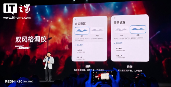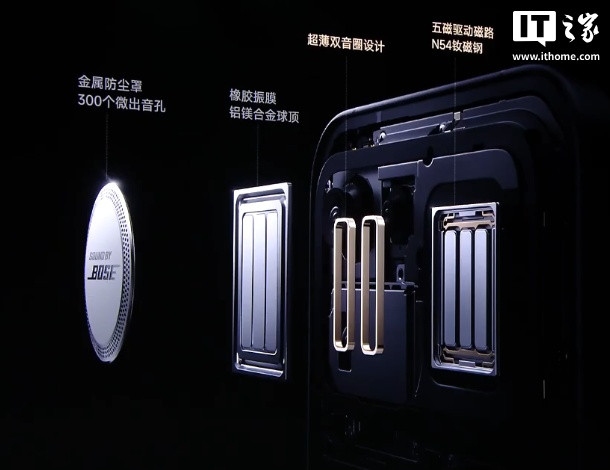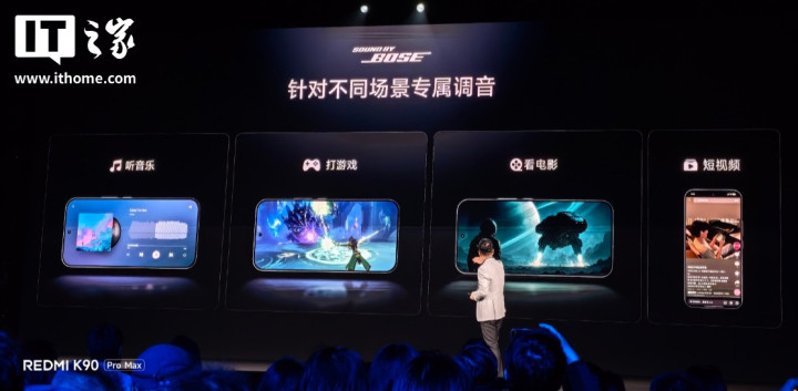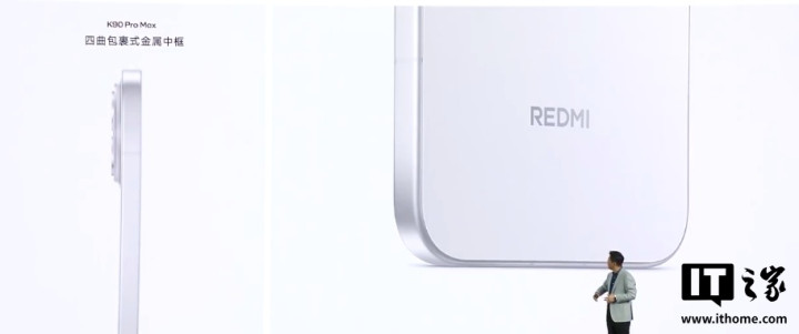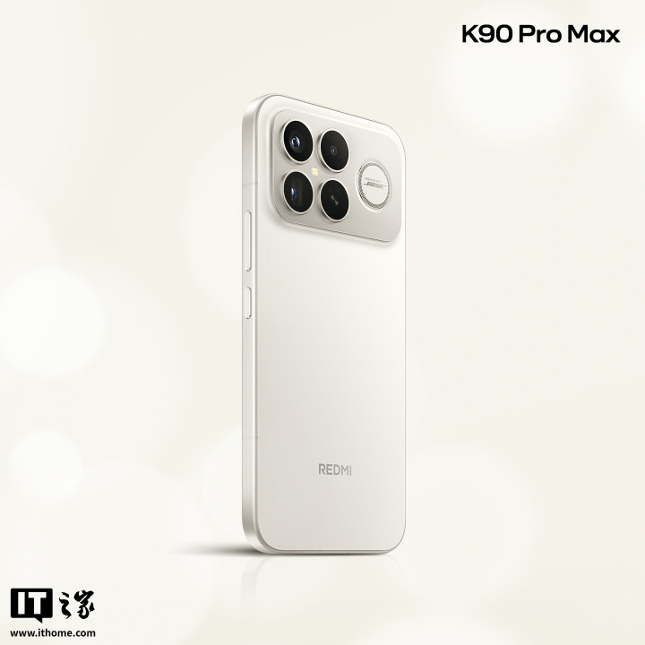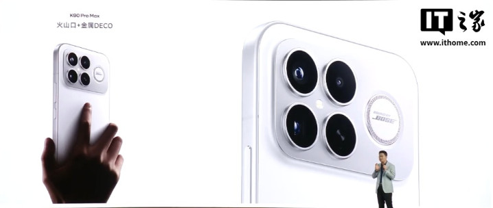 REDMIK90ProMax具备大R角和超窄边框,背面用上了一体式金属火山口相机Deco,在摄像模组的右侧还有一个尺寸明显的扬声器,中心区域更是印上了“SoundbyBose”的字样。