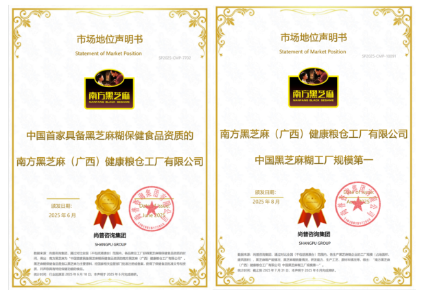 南方黑芝麻(000716)集团旗下的南方黑芝麻(广西)健康粮仓工厂有限公司荣获尚普咨询集团颁发的两项市场地位声明书——