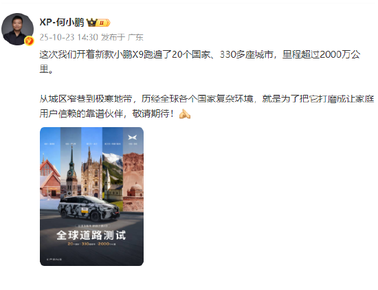 此外,何小鹏发布微博表示,X9的测试里程已经超过2000万公里。“开着新款小鹏X9跑遍了20个国家、330多座城市,里程超过2000万公里。”。